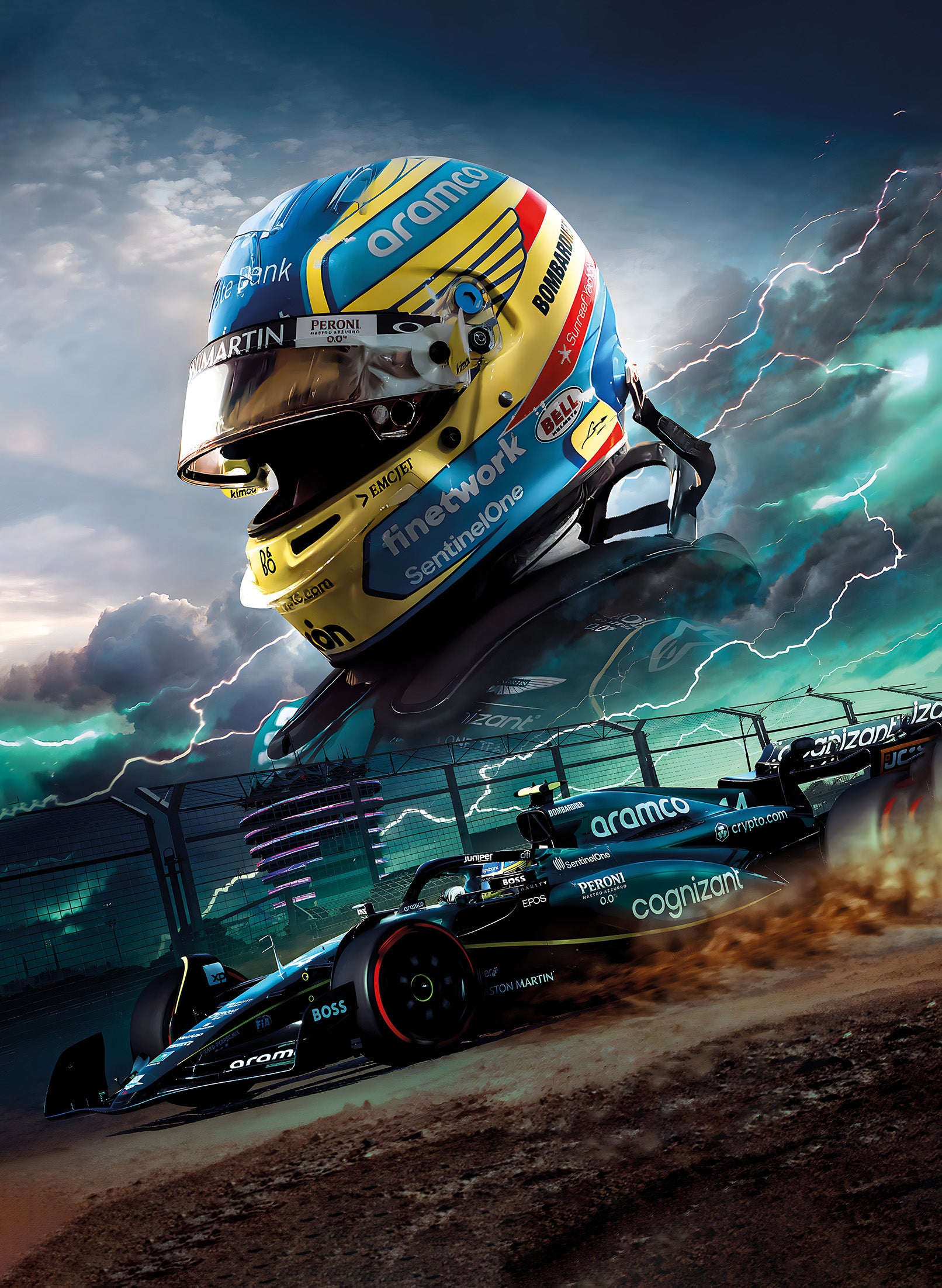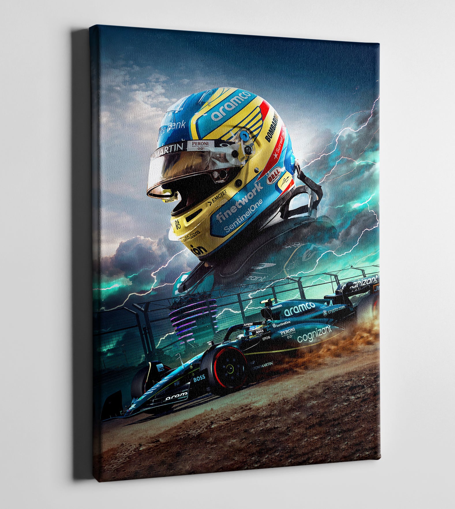 De poster toont een indrukwekkende afbeelding van een F1 coureur die met hoge snelheid over het circuit raast, omringd door een aura van dynamiek en energie. Met zijn gedetailleerde weergave van de auto, geeft deze poster je het gevoel alsof je midden in de actie zit.