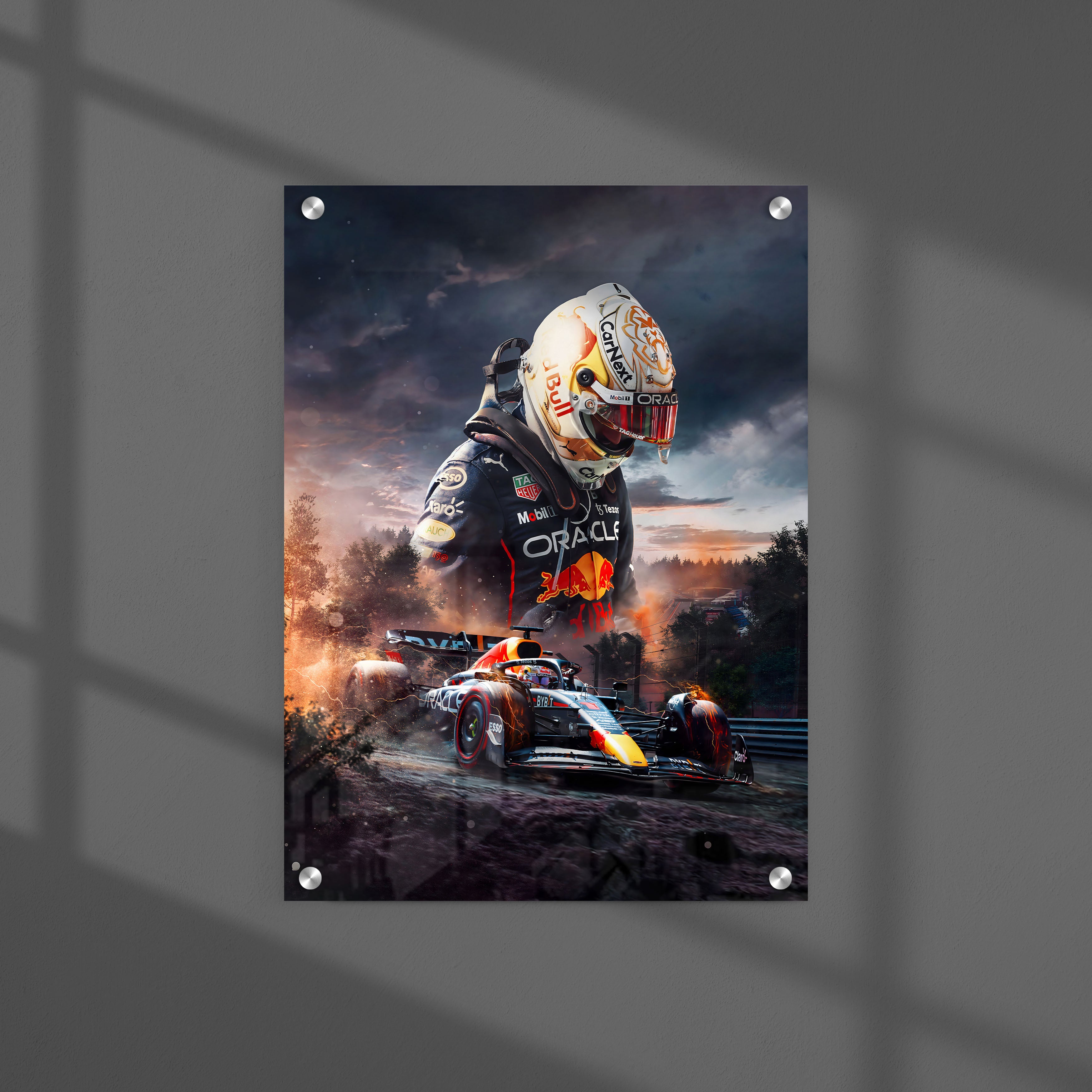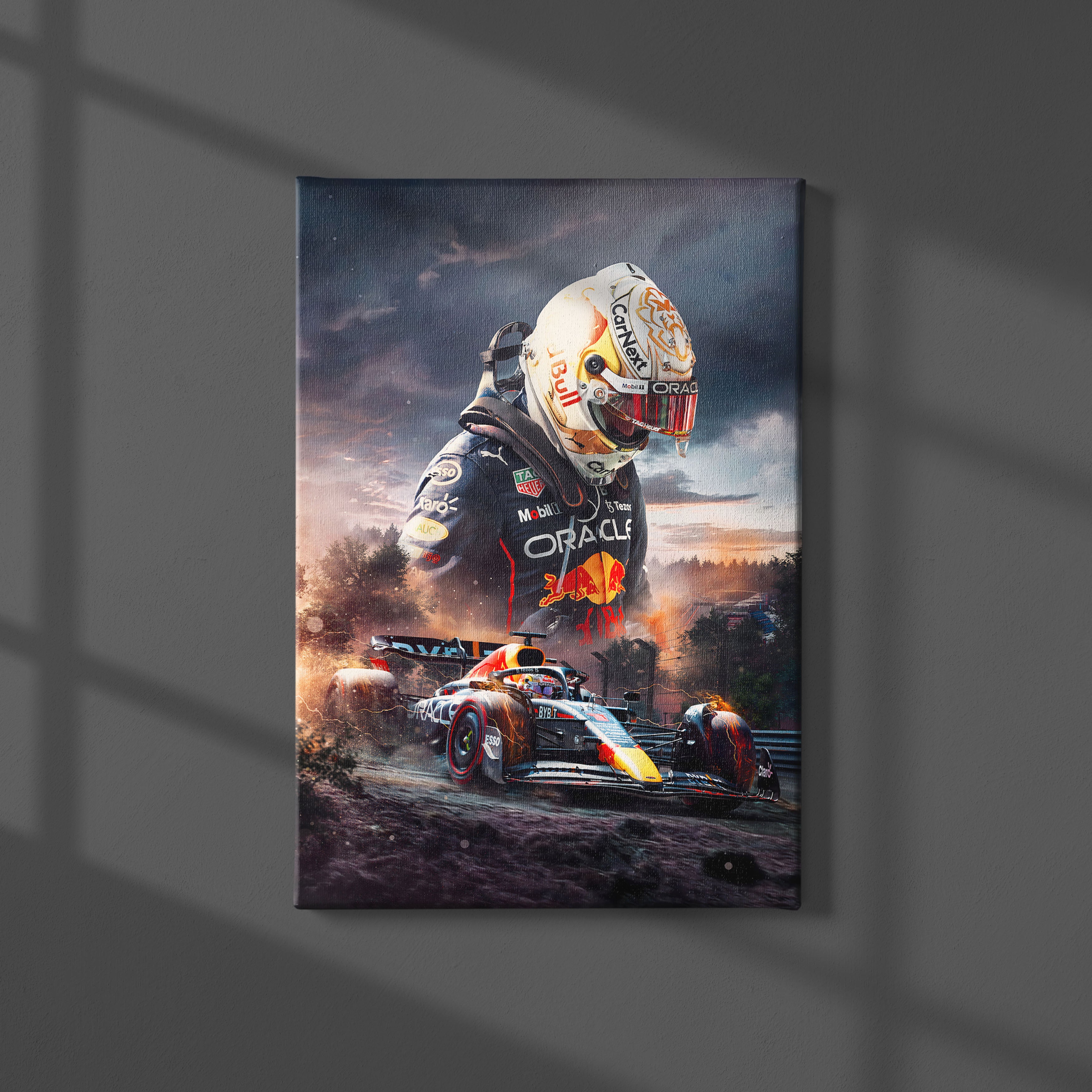 De poster toont een indrukwekkende afbeelding van een F1 coureur die met hoge snelheid over het circuit raast, omringd door een aura van dynamiek en energie. Met zijn gedetailleerde weergave van de auto, geeft deze poster je het gevoel alsof je midden in de actie zit.