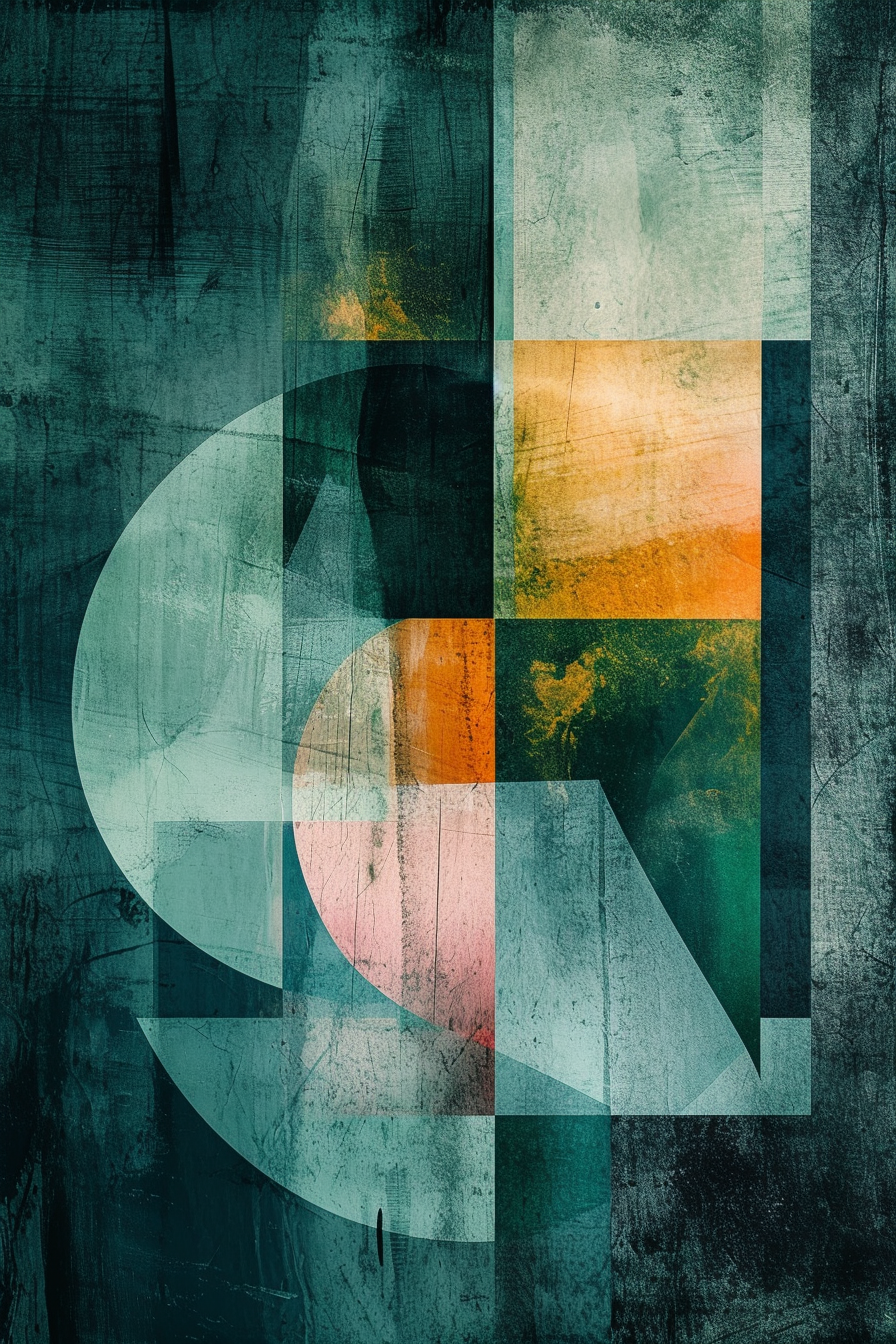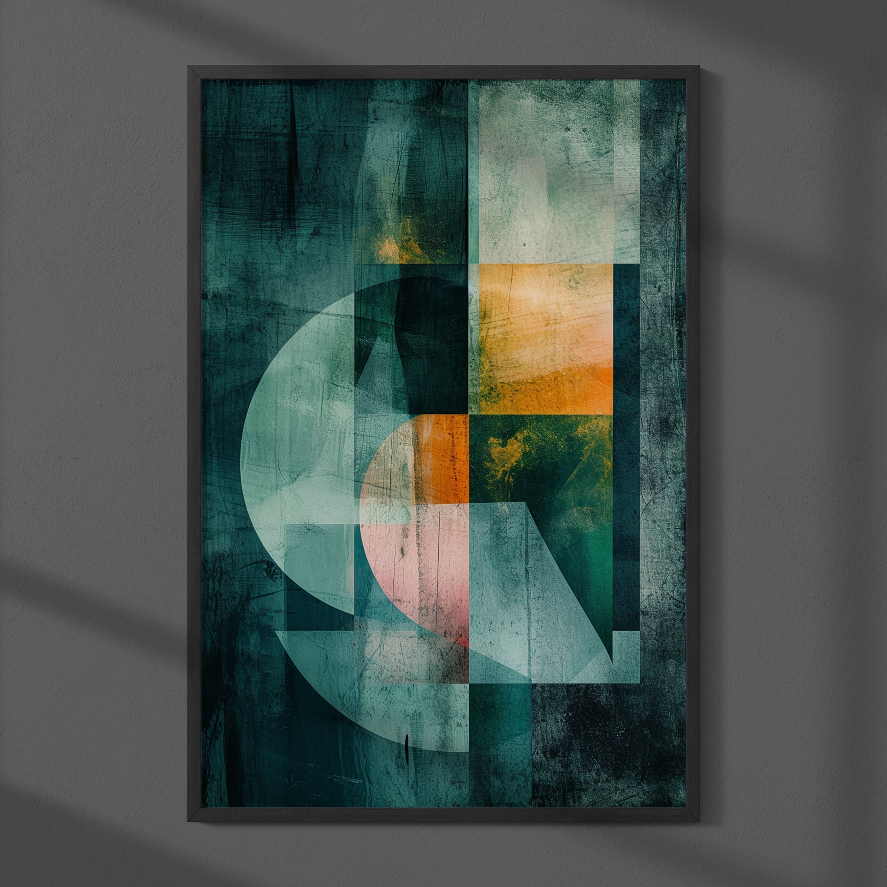 Geef je interieur een moderne en artistieke uitstraling met dit abstracte geometrische kunstwerk. De mix van diepe groentinten, warme goudaccenten en subtiele roze details zorgt voor een krachtig en stijlvol contrast dat direct de aandacht trekt.