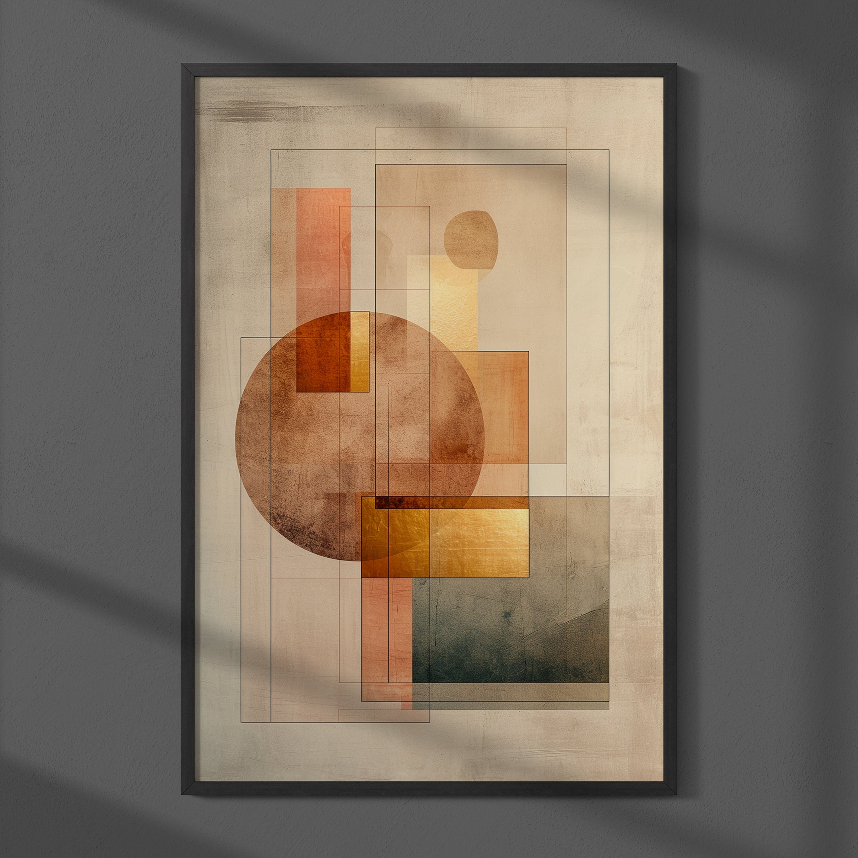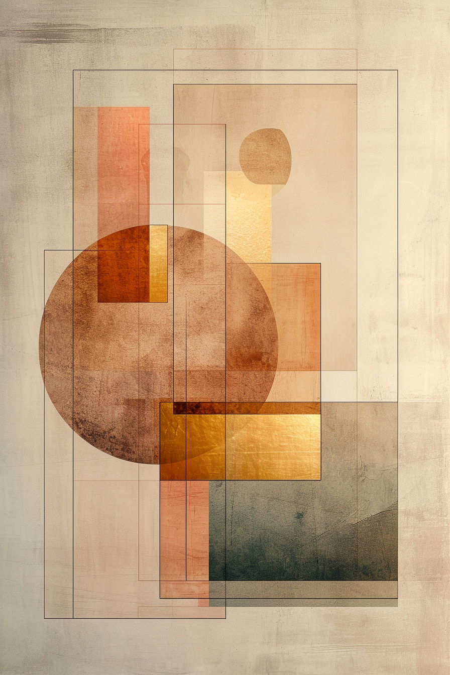 Ontdek de kracht van eenvoud en complexiteit in één beeld. “Diepte in Vorm” is een verfijnde abstracte kunstprint die speelt met transparantie, geometrie en textuur. Gelaagde cirkels, rechthoeken en vierkanten in warme aardetinten zoals koper, goud, donkergroen en beige creëren een harmonieus samenspel van vorm en diepte. De subtiele overlappingen en fijne contourlijnen zorgen voor een visuele ervaring die blijft intrigeren.