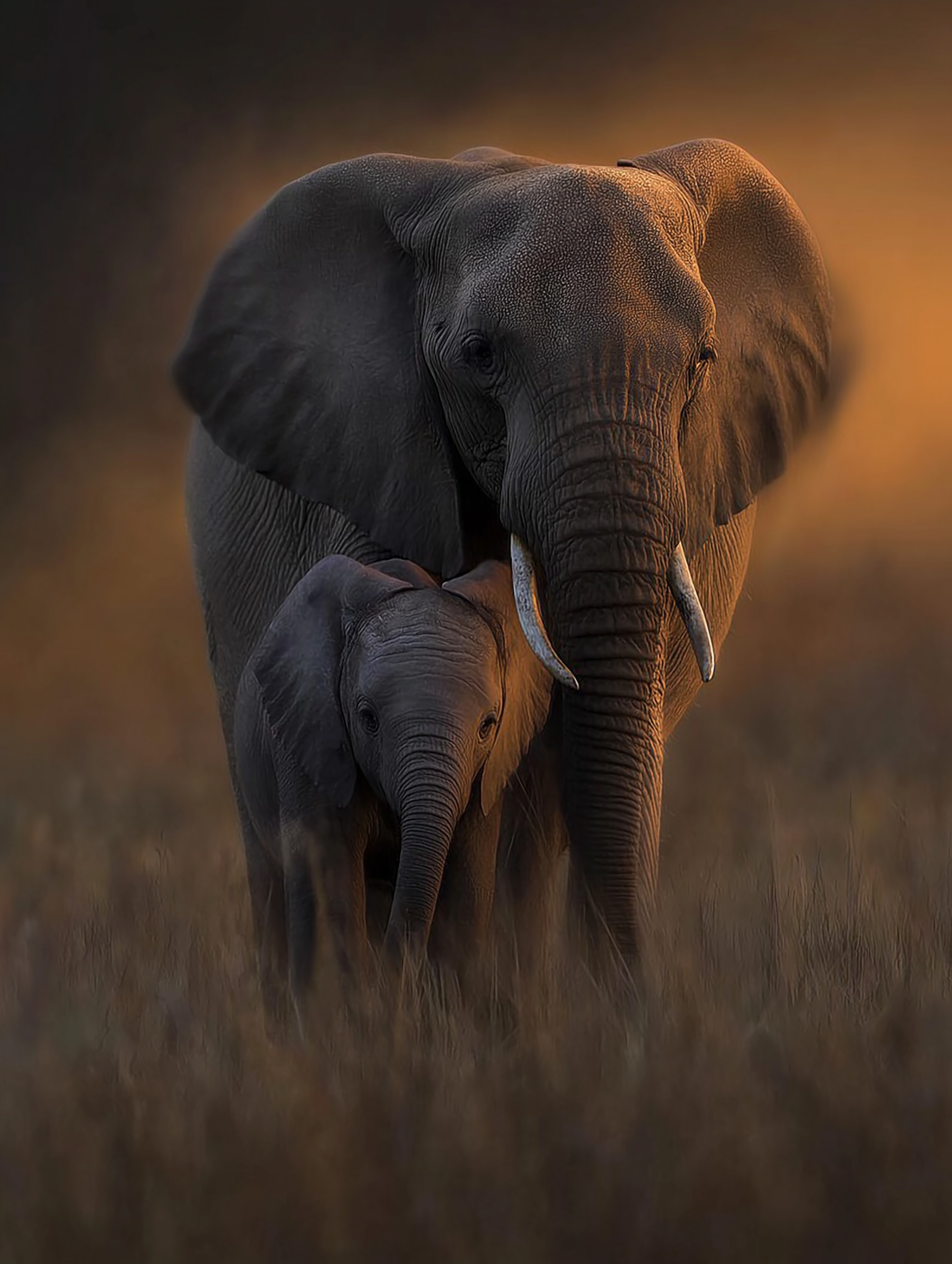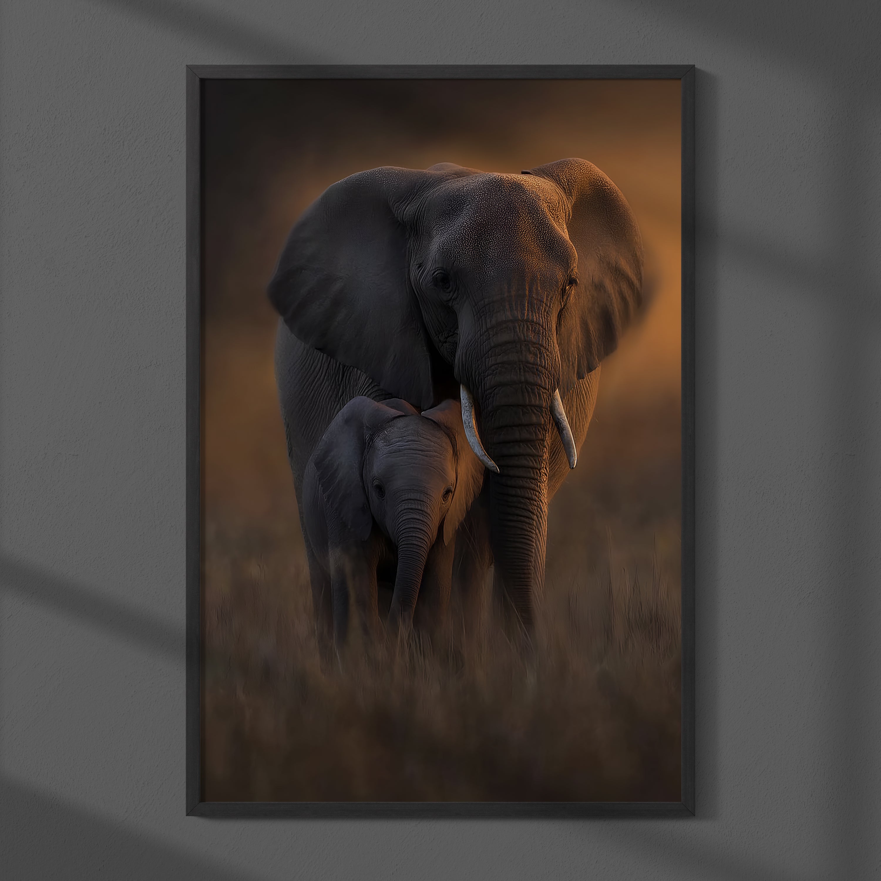 Vang de kracht van verbondenheid en natuurlijke schoonheid met Golden Bond, een indrukwekkende fotoprint van een volwassen olifant en haar kalf in een warm verlicht savannelandschap. Deze opname, vastgelegd tijdens het gouden uur, straalt zachtheid, bescherming en majestueuze rust uit. De tedere aanraking van de slurf en de serene blik van beide dieren maken dit beeld tot een visueel gedicht over familie en instinct.