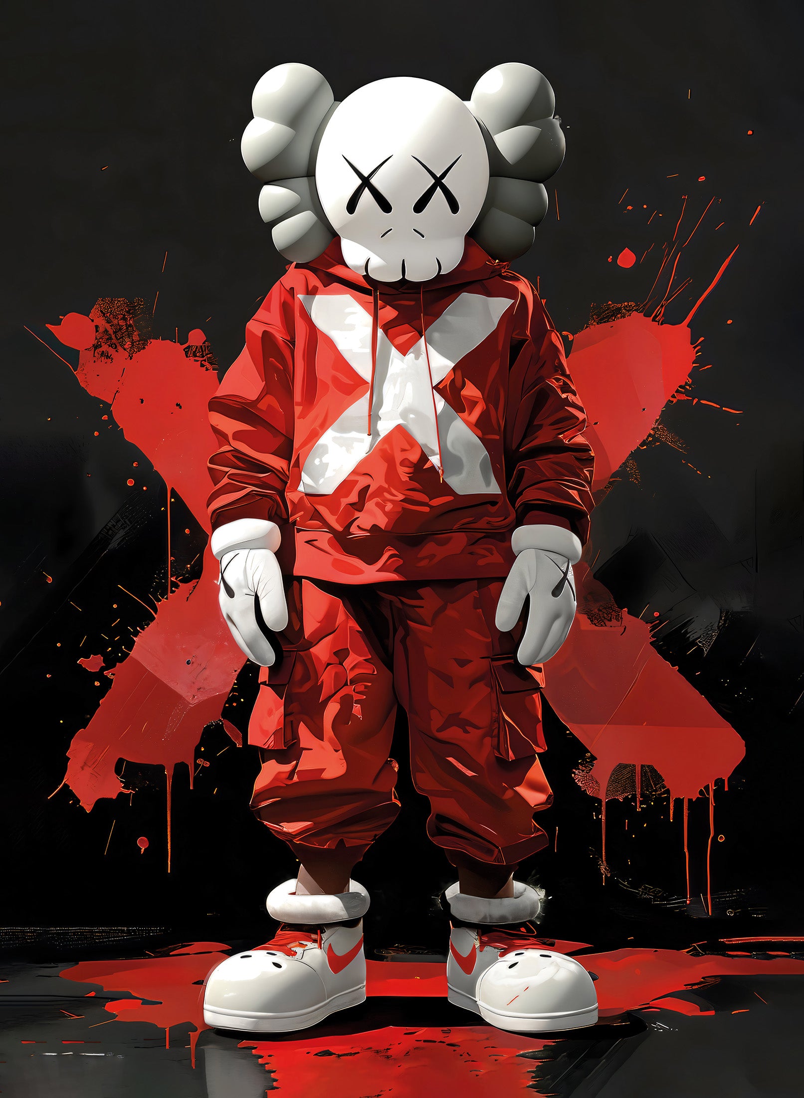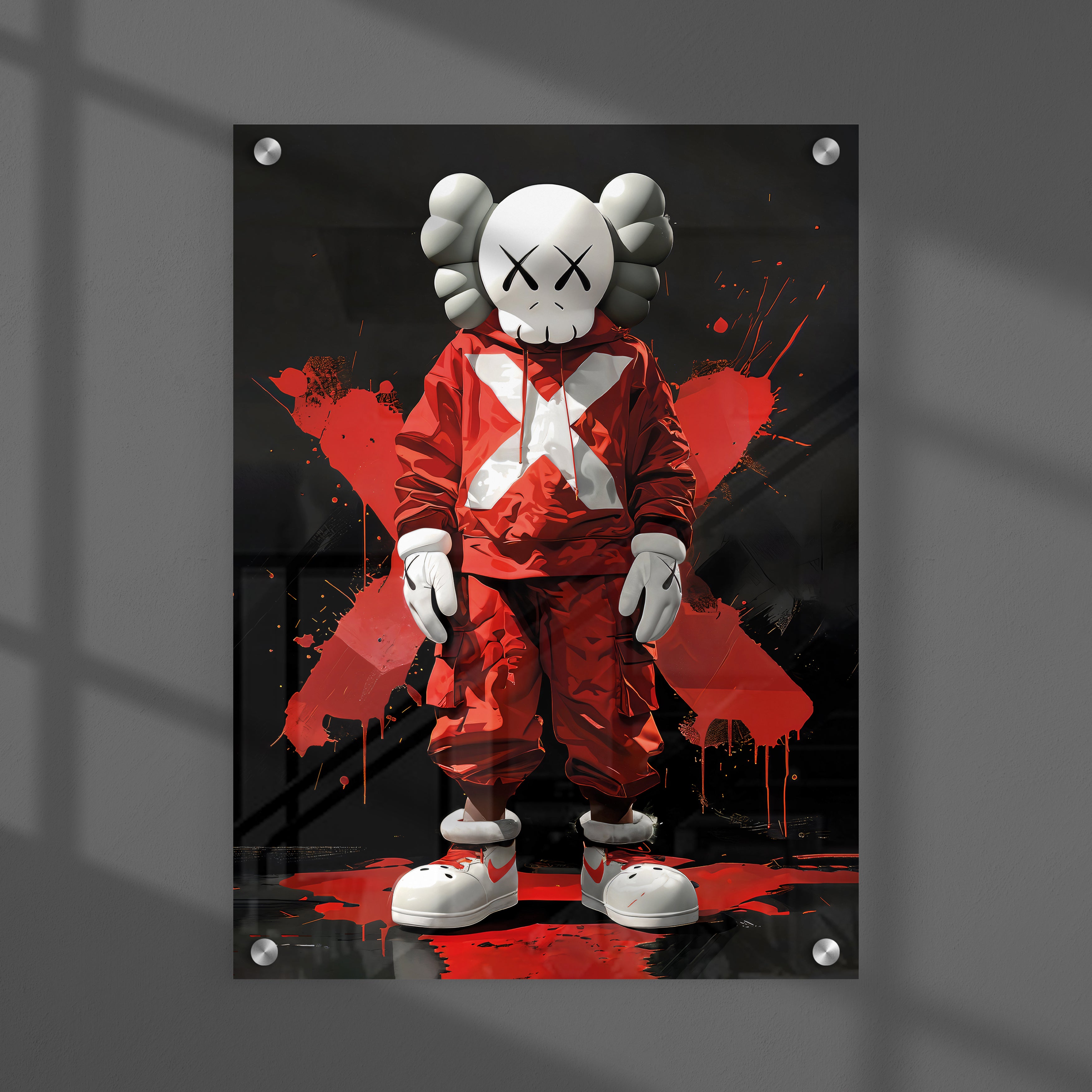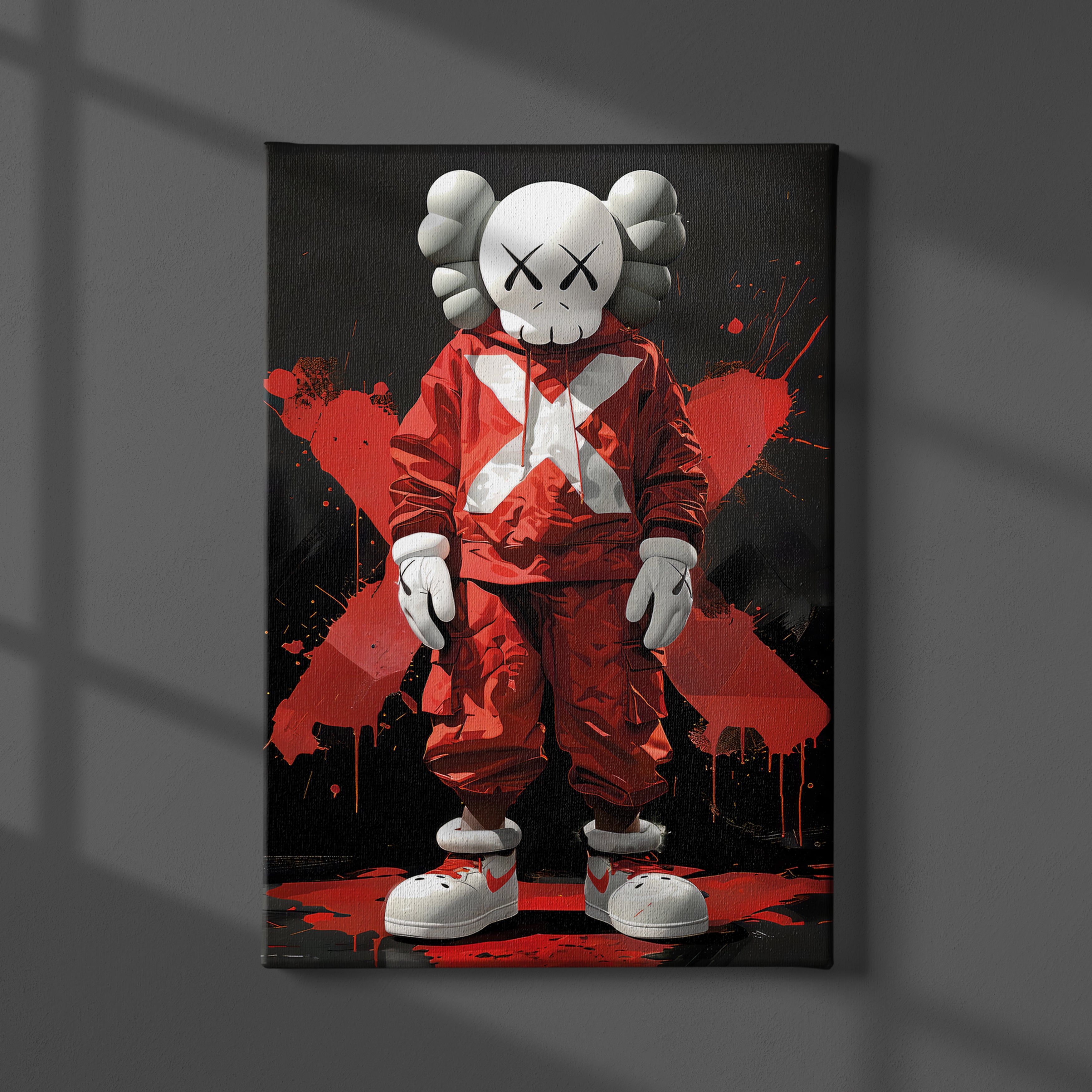 Geef je interieur een urban en moderne uitstraling met deze unieke KAWS-poster! Dit kunstwerk toont een iconisch KAWS-figuur in een rode hoodie met een opvallende witte "X" op de voorkant, karakteristiek voor de populaire KAWS-stijl.