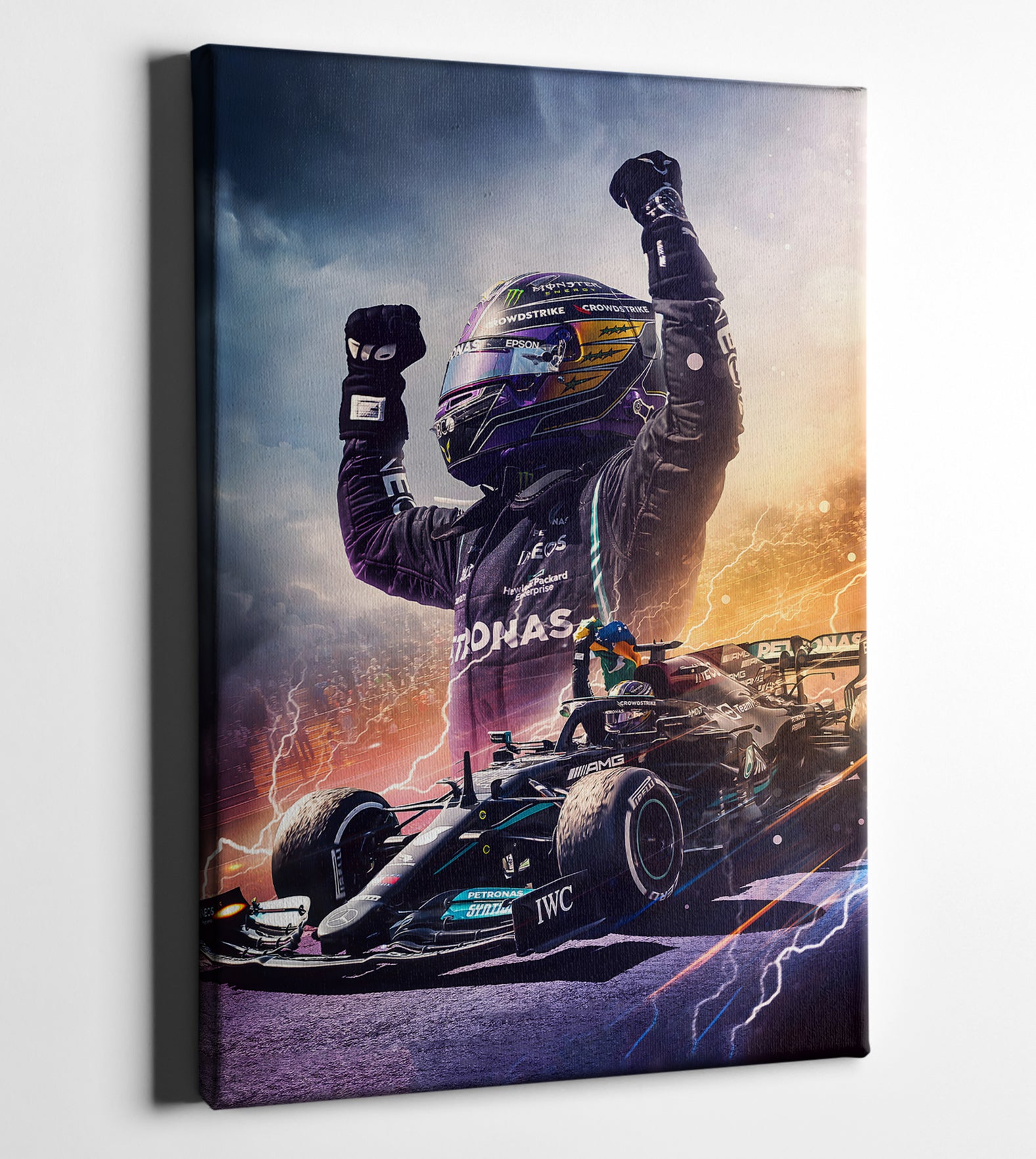 De poster toont een indrukwekkende afbeelding van een F1 coureur die met hoge snelheid over het circuit raast, omringd door een aura van dynamiek en energie. Met zijn gedetailleerde weergave van de auto, geeft deze poster je het gevoel alsof je midden in de actie zit.