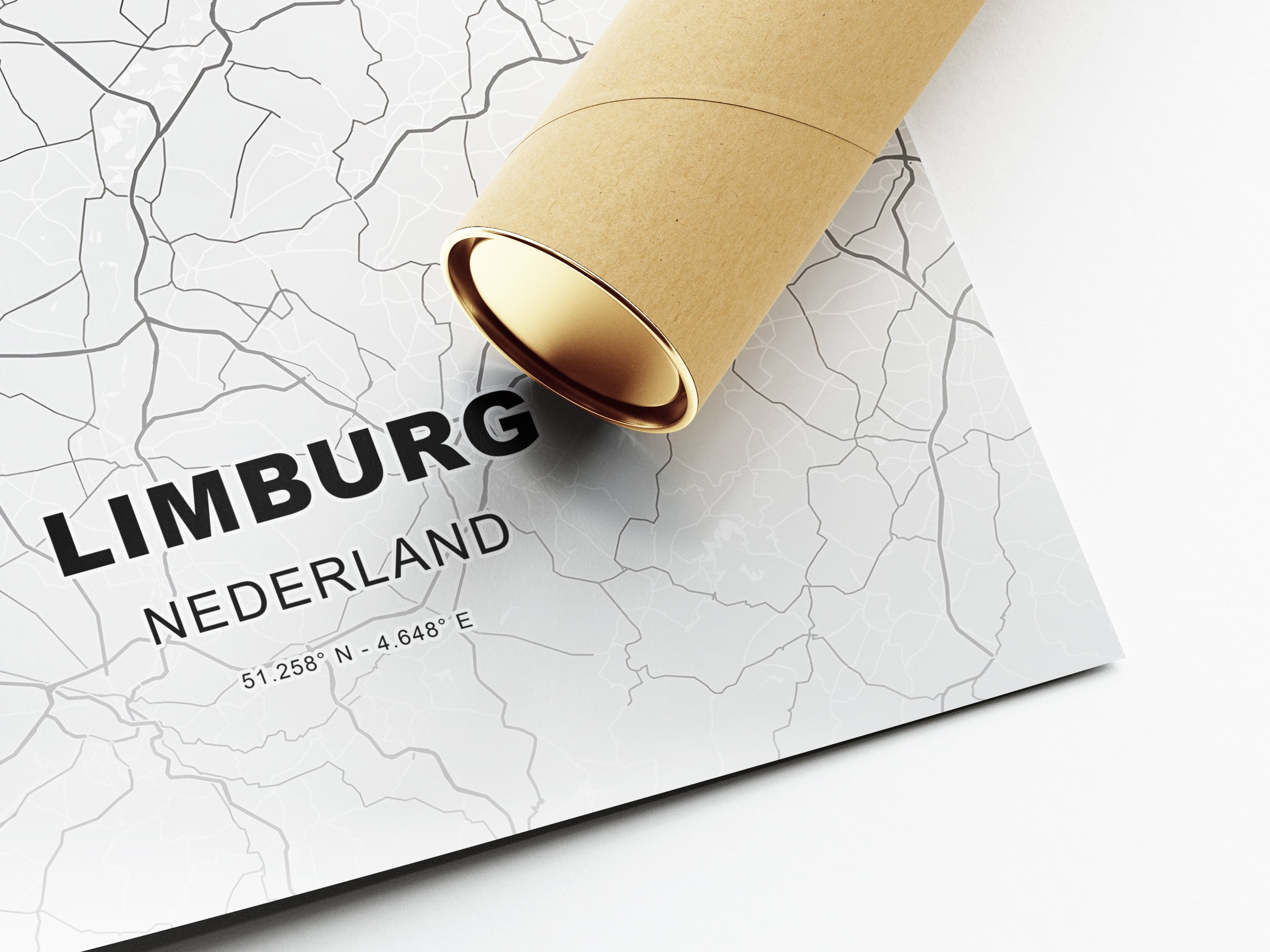 Deze poster toont een prachtige kaart van de provincie Limburg, met alle belangrijke steden, dorpen, bezienswaardigheden en de grens met België en Duitsland. De poster is gedrukt op hoogwaardig papier met heldere kleuren die de natuurlijke schoonheid en rijke geschiedenis van de regio weergeven.