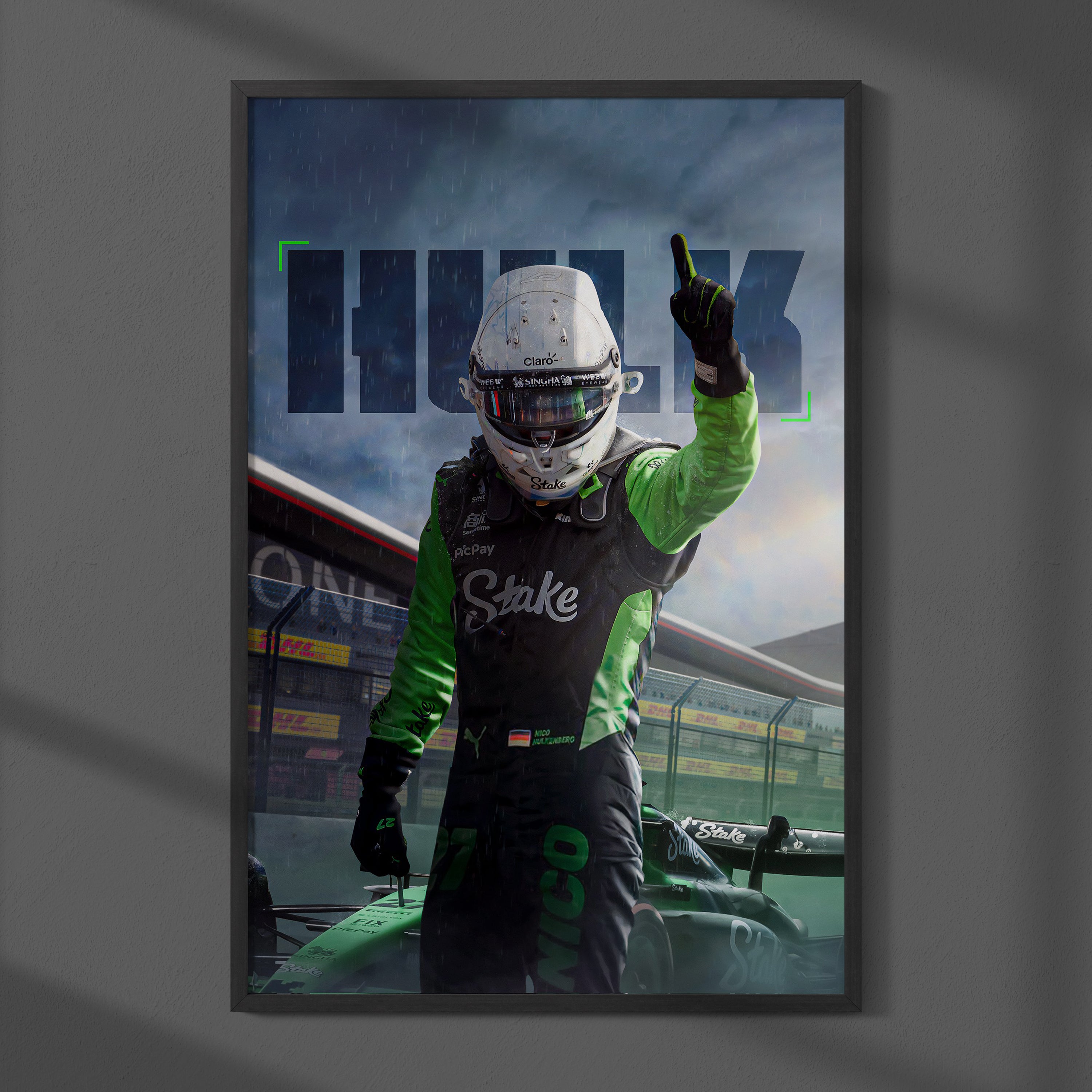 Vier de kracht en passie van Formule 1 met deze spectaculaire Nico Hülkenberg poster! Het design laat de Duitse coureur zien in zijn iconische groene racepak, fier in de regen en klaar om te strijden. Met de krachtige tekst HULK op de achtergrond straalt deze poster pure energie en racetemperament uit. Een echte must-have voor fans van Hülkenberg en de Formule 1.